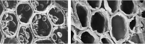 左圖是未經(jīng)處理的竹子分子結(jié)構(gòu),右圖是經(jīng)過處理之后的竹子分子結(jié)構(gòu)。